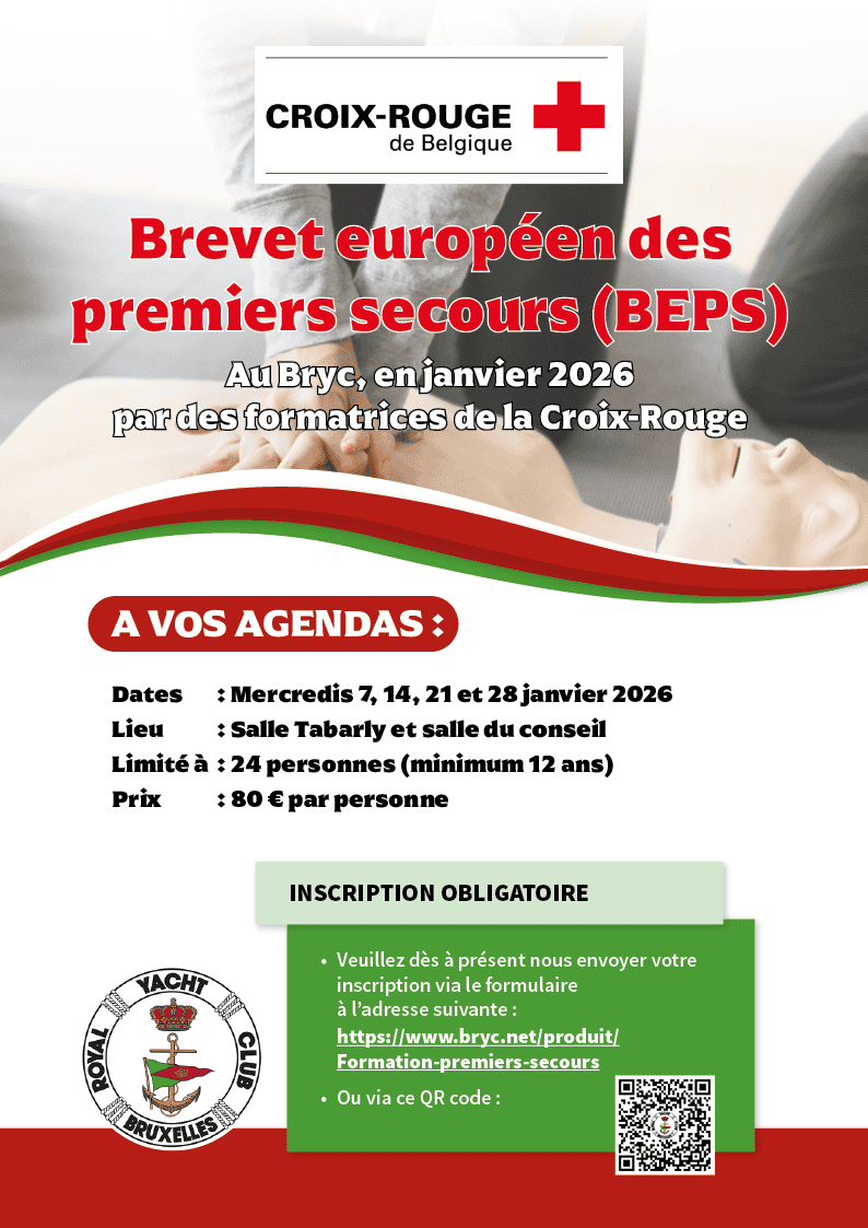 Le B.R.Y.C., en collaboration avec l’antenne de la Croix-Rouge d’Auderghem vous donne la possibilité de suivre la formation pour Le Brevet Européen de Premiers Secours (BEPS) dans votre club.